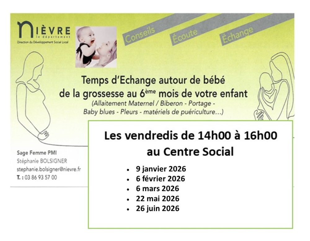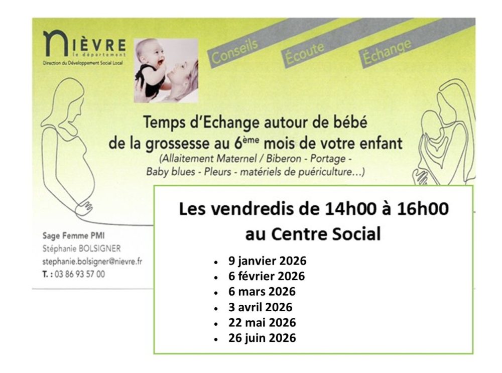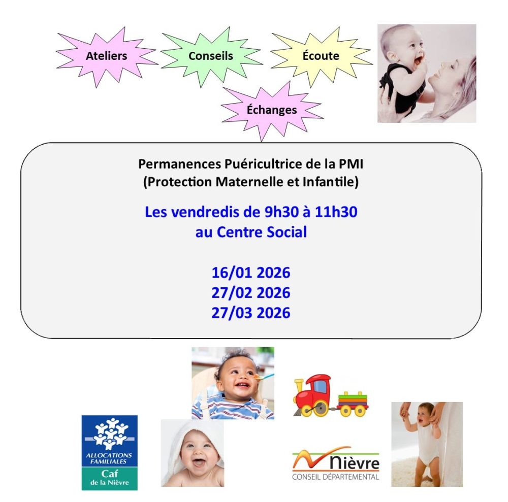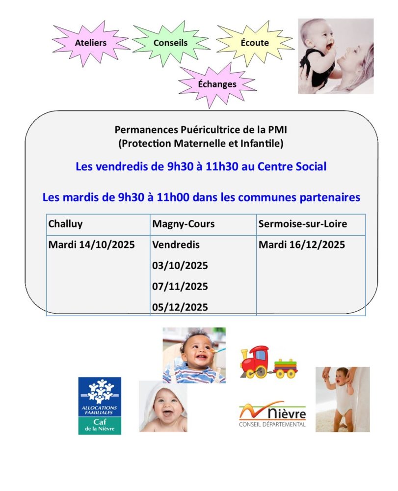 Conseils – Écoute – Échanges Permanences Puéricultrice de la PMI(Protection Maternelle et Infantile)au Centre Social des vendredis de 9h30 à 11h30 (voir dates) et des mardis de 9h30 à 11h00 dans les communes partenaires (voir dates) En lien avec les ateliersdu RPE (Relais Petite Enfance)